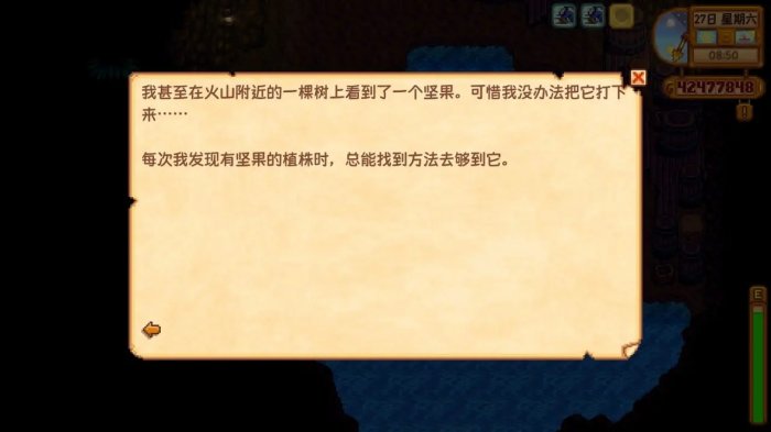 就简单说了下金核桃藏匿的地方,还是建议各位想找的话去查看攻略来找,不想找就直接到joja鹦鹉那里买,这纸条属于是找过的人能看懂,没找过的人还是一头雾水的类型