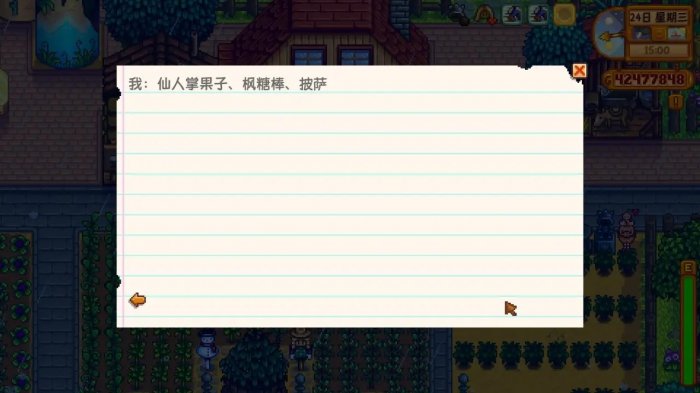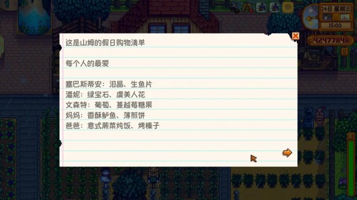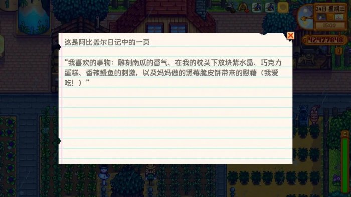 来自阿比盖尔的日记,就是告诉玩家阿比盖尔最爱的礼物有1.南瓜,2.紫水晶,3.巧克力蛋糕,4.香辣鳗鱼,5.黑莓脆皮饼,都是她爱吃的!