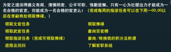 官职任务分文官任务和武官任务,推荐各位少侠从文官任务入手,因为文官任务要相对简单一些。