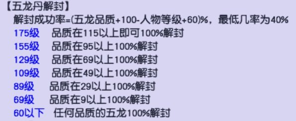 这时候,少侠们可以尝试的做法。众所周知,虽然五龙丹解封有品质的要求,但以175级为例,五龙丹只需要115品质即可100%解除封印。