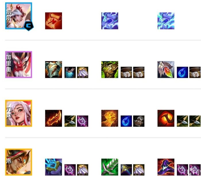 凯尔(天使):速度护符(红)+原力卷轴(蓝)+力量之书(蓝)。