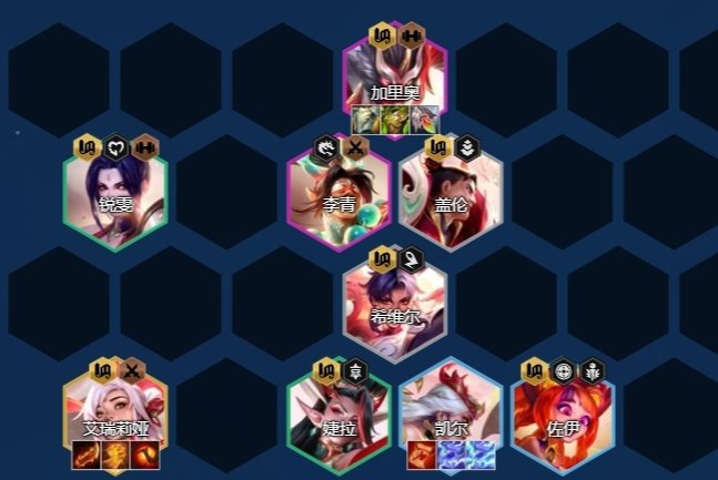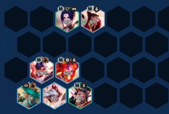 3-5到3-7上7人口,补充阵容羁绊,可以添加俄洛伊开2护卫2法师,如果有加里奥可以暂时替换婕拉,有卡莎后可以替换巴德。若是有剪纸仙灵转职,同时也有加里奥,7人口就开7剪纸。