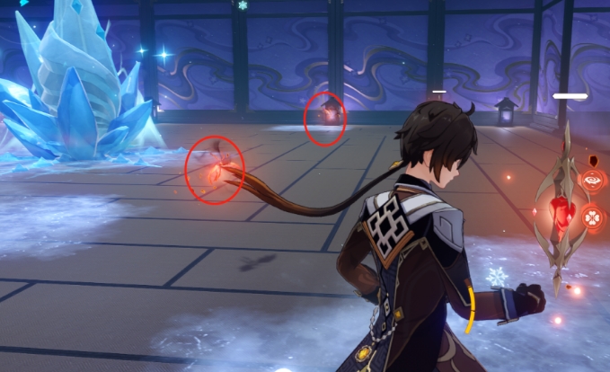 在打冰女士的时候,打到锁血后,会变成一块冰块(最好带三个火元素,班尼特最好,可以回血,加个有盾的,钟离这种)