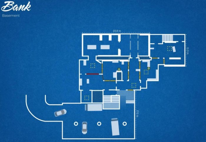 旧领事馆的上下点是育碧无数次调整、平衡过后的产物,理论上在防弹摄像头、斜眼等的辅助下,进攻方无法下包,下包就被地板C4直接炸死;防守方甚至有三个楼梯从地下室回到一楼的,但依旧无法解决一个问题——只要被进攻方下包,就很难或者走到一楼。过于一锤子买卖,两点之间很难有联动(更准确的说是A增援到B这种)