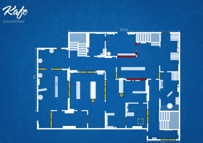 咖啡馆一楼和三楼都是AB两点在一个大房间之中,或者在一个大的开阔空间之中。普遍中间有门作为主要通过路径。这种炸弹点理论上是进攻方非常友好的。因为开阔区够大,交战枪线够长,那么进攻方就能发挥武器和倍镜的优势。并且暗含的一点是因为空间够大,所以点内能够选择的掩体有限,防守方也没什么太大自由移动的空间,并且进攻方还常常有一个足够能下包的掩体。但实际情况下,防守方就是要缩小交战距离,赢得自身更大的活动空间。