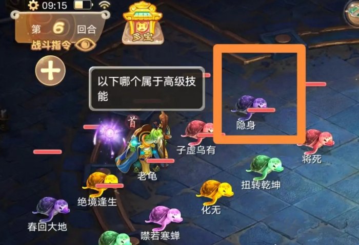 勇斗玩法,满分288分,组四个挂机队友,队长负责答题就好,老龟会提问一些简单的游戏常识,答案也是非常明显得,下图提问哪个属于高级技能,只有一个隐身是哈,其余的都是终极,队长过去普攻隐身名字得宝宝就好了。