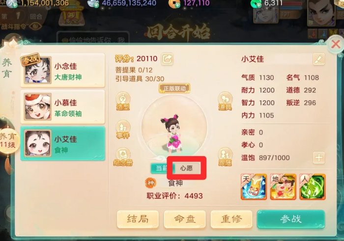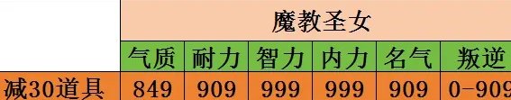以女孩为例来讲,培养时,建议先把前5个属性培养到差一张逍遥符(94点属性)就能达到图上属性之后,剩下的开始培养叛逆,直到剩5次培养结局和孩子7次事件做完,然后对比6个属性,先补齐前5个属性到图上属性,能多不能少,还有剩余次数就补叛逆,最后吃30个圣火令,你养育等级高,6个属性就都能过999,你养育等级不高,也能保证前5个属性过999,叛逆大概在600到999之间。男孩也是一样,把叛逆改成道德,道具吃聚宝盆。