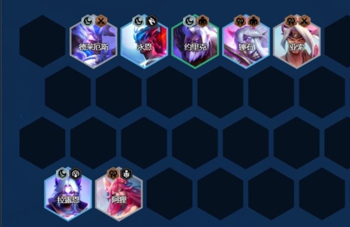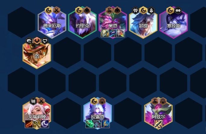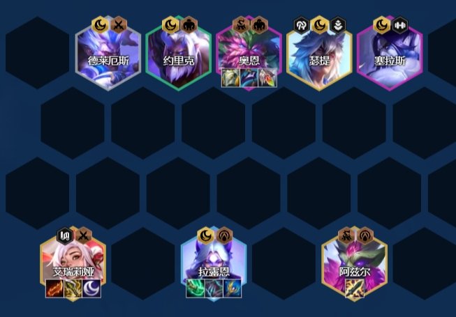 4-2拉8人口,然后大刷一波,找出一张艾瑞莉娅,并开出6夜幽。没阿兹尔先用迦娜过渡,没瑟提先用永恩开6夜幽。8人口将阵容体系大部分英雄搜出两星,之后再上9人口,拉露恩不用追三。