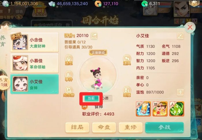 以女孩为例来讲,培养时,建议先把前5个属性培养到差一张逍遥符(94点属性)就能达到图上属性之后,剩下的开始培养叛逆,直到剩5次培养结局和孩子7次事件做完,然后对比6个属性,先补齐前5个属性到图上属性,能多不能少,还有剩余次数就补叛逆,最后吃30个圣火令,你养育等级高,6个属性就都能过999,你养育等级不高,也能保证前5个属性过999,叛逆大概在600到999之间。男孩也是一样,把叛逆改成道德,道具吃聚宝盆。