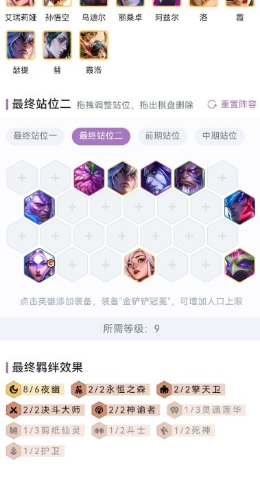 下面分别是8-10级的阵容图,1-7级就不说了,记住一句话就是只留夜幽牌就行,夜幽+石头人琪亚那随便混到7级,哪怕连败都无所谓